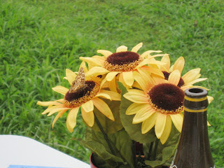 The butterfly landed on the fake silk sunflowers hoping to get some pollen or whatever butterflies eat from a sunflower.....nectar? Poor butterfly was confused. haha :) We didn't become millionaires at the sale but hey we cleared some junk, made a few bucks and now the leftovers are going to Goodwill. :)