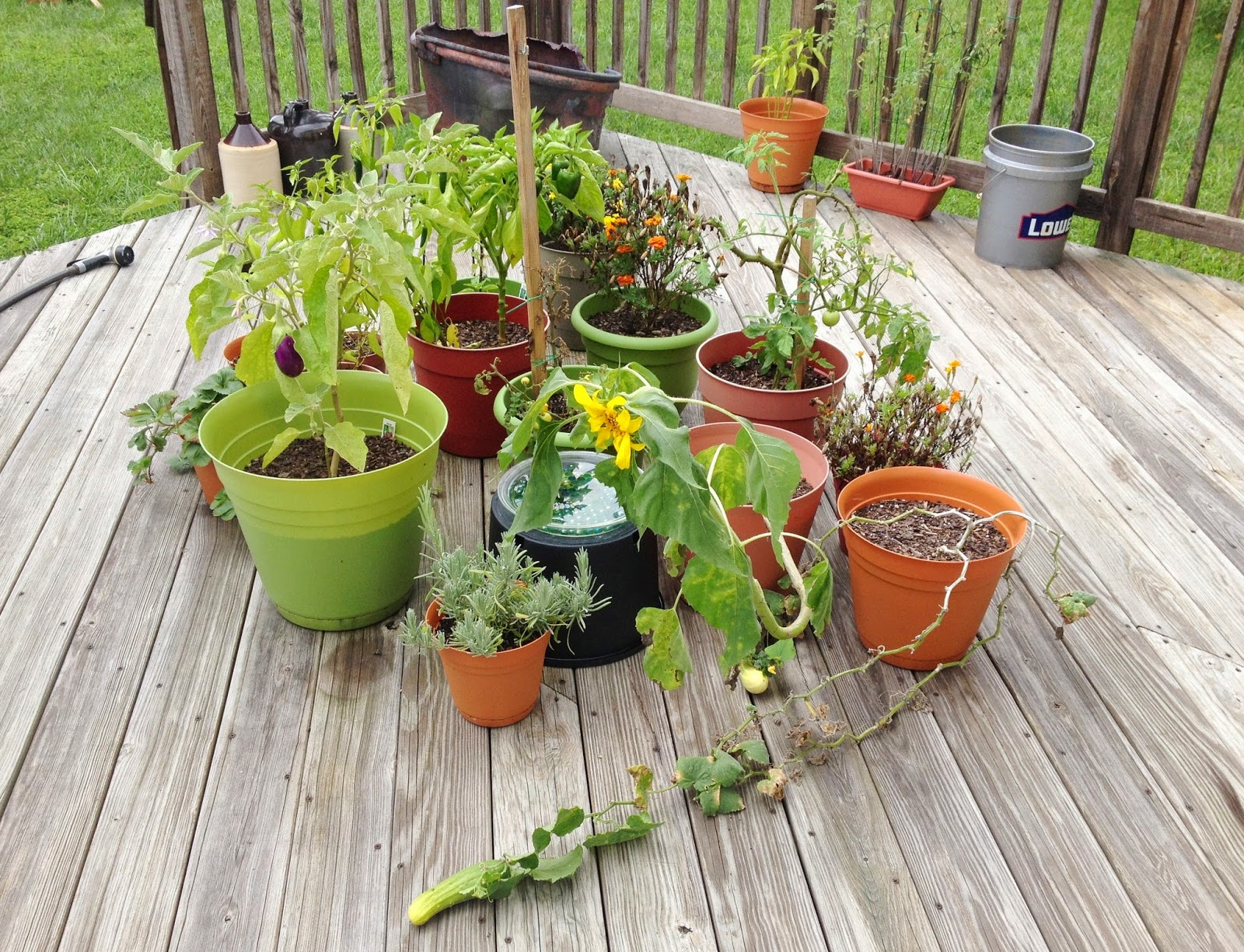 This evening after dinner I went outside and started cleaning up a bit. I took the plants off my deck that I didn't need anymore and put them with the other pots that are done.